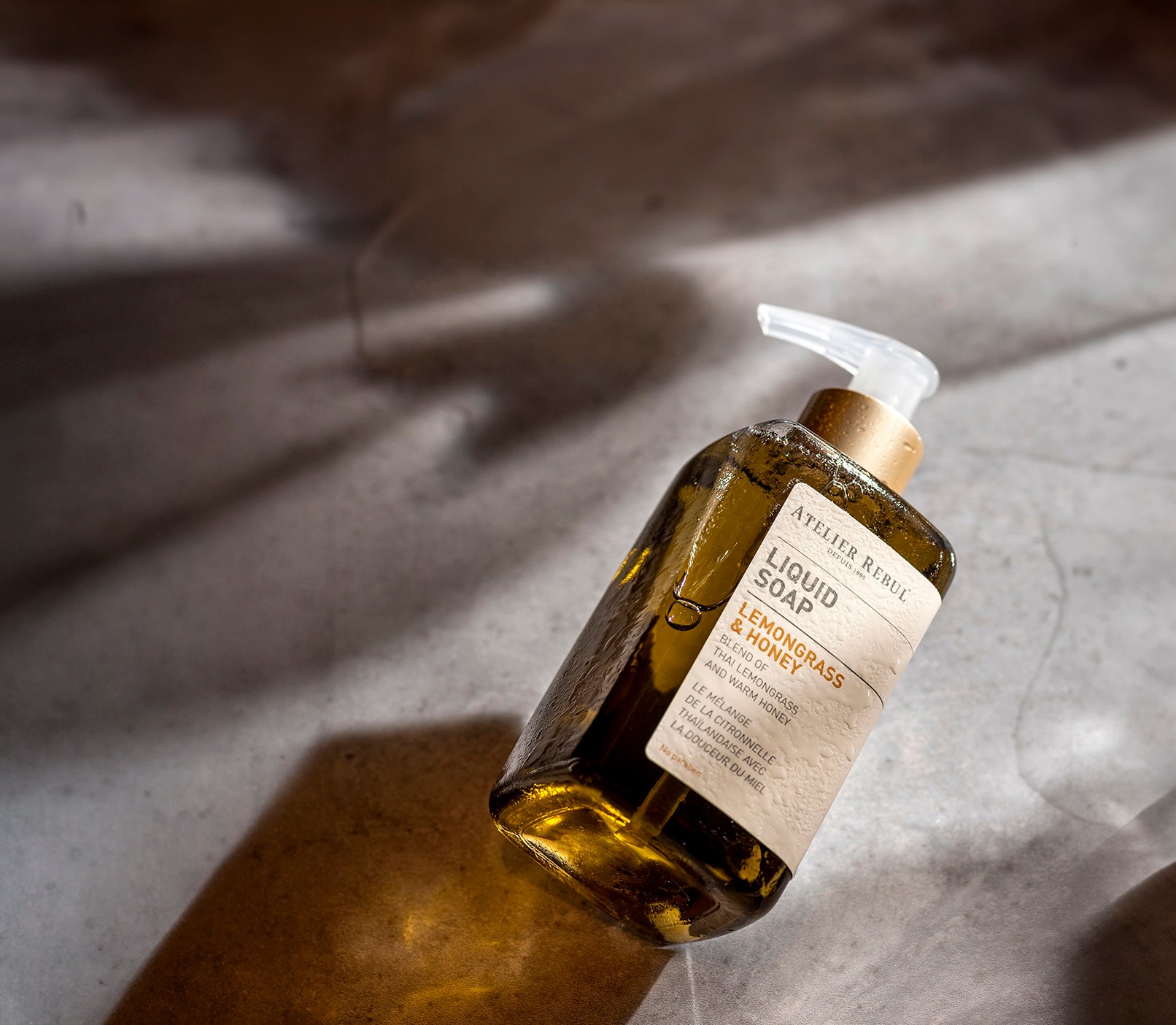 Savon liquide pour les mains à base de citronnelle et de miel. Nourrit les mains avec des ingrédients hydratants pendant le lavage.